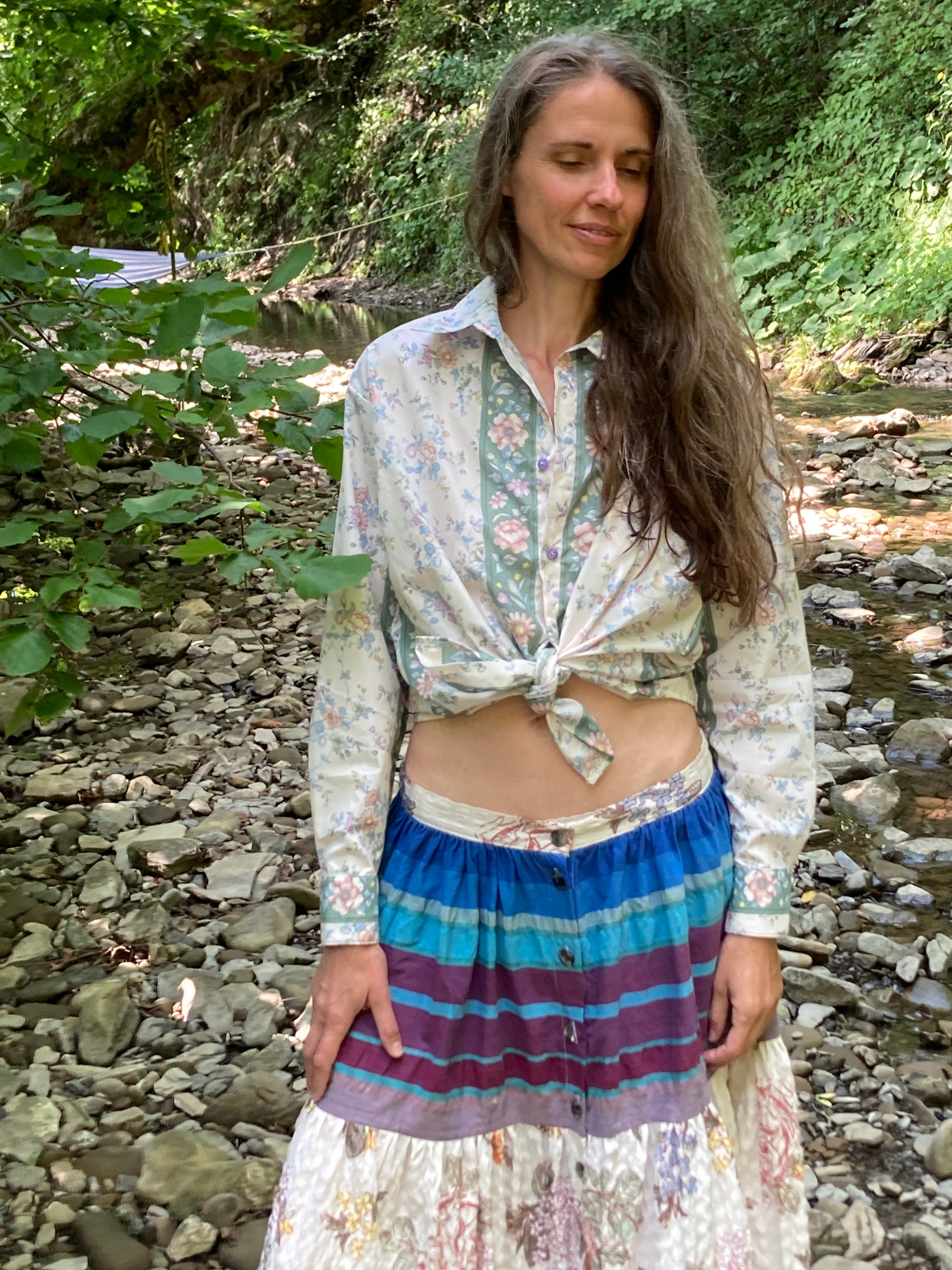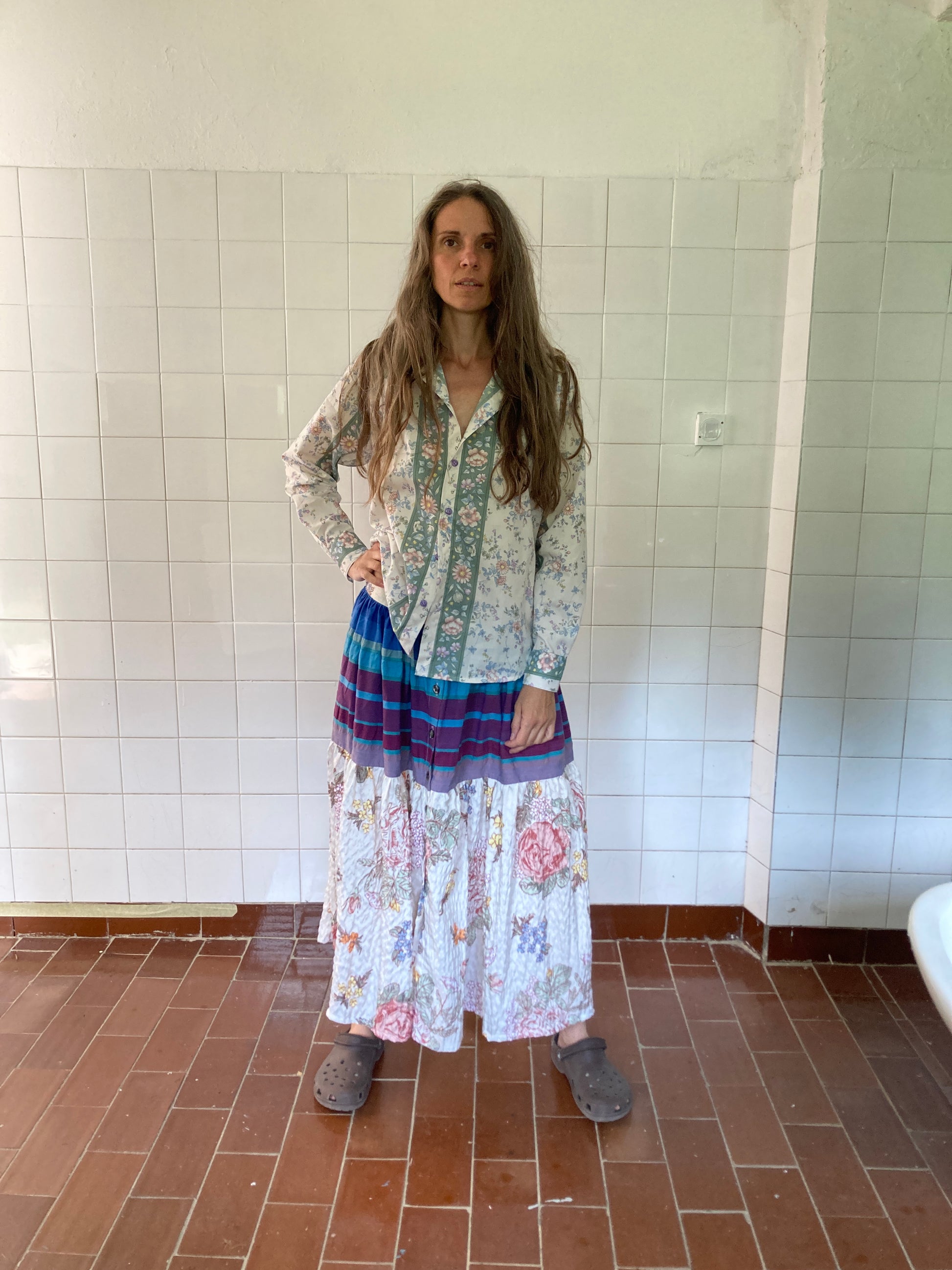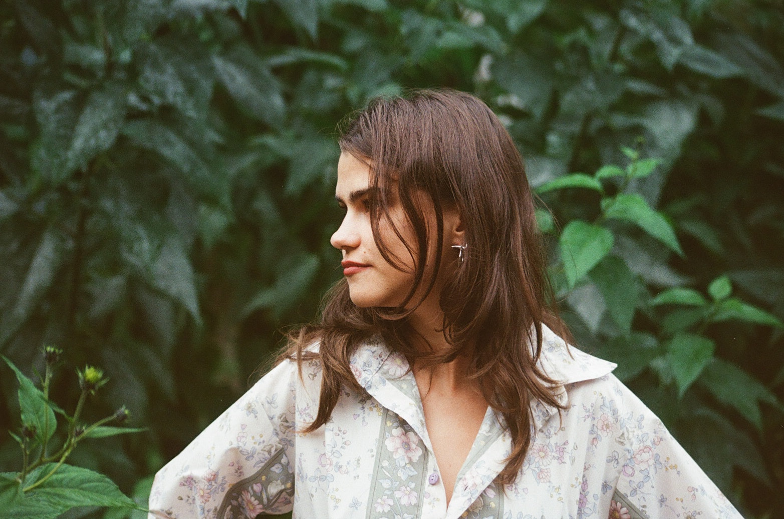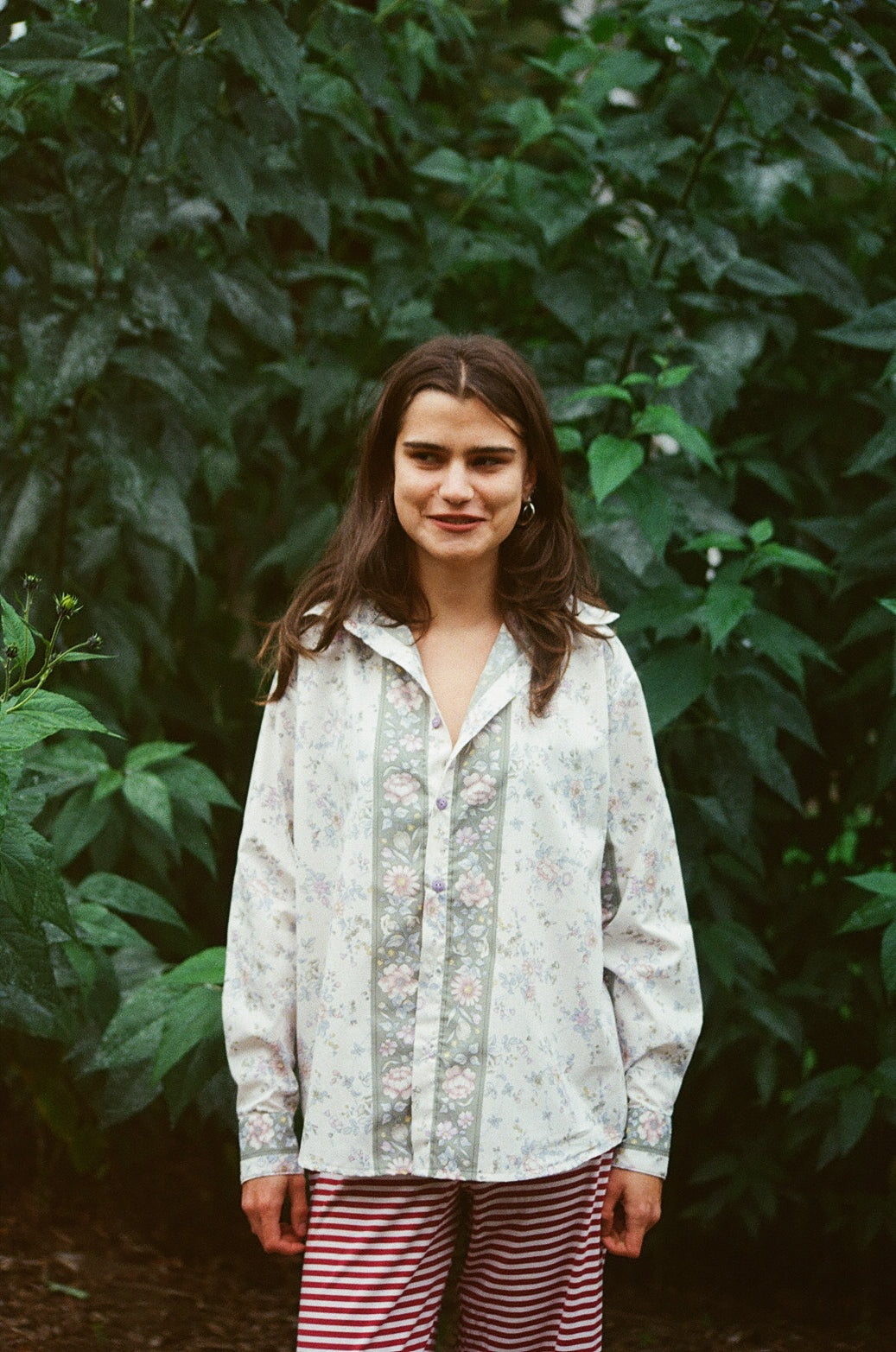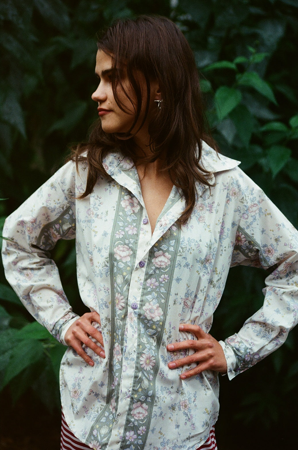 Koszula z tkaniny recyklingowej. Luźny, uniwersalny krój, odpowiedni dla osób noszących rozmiary od S do L. Modelka ma na sobie rozmiar uniwersalny, na co dzień nosi rozmiar S.