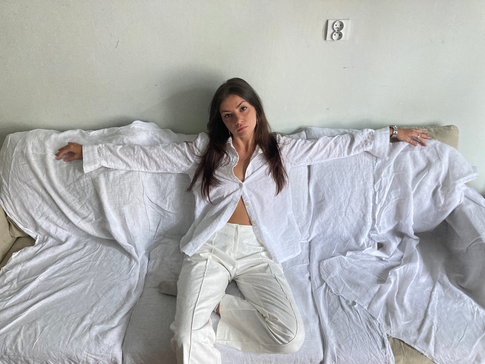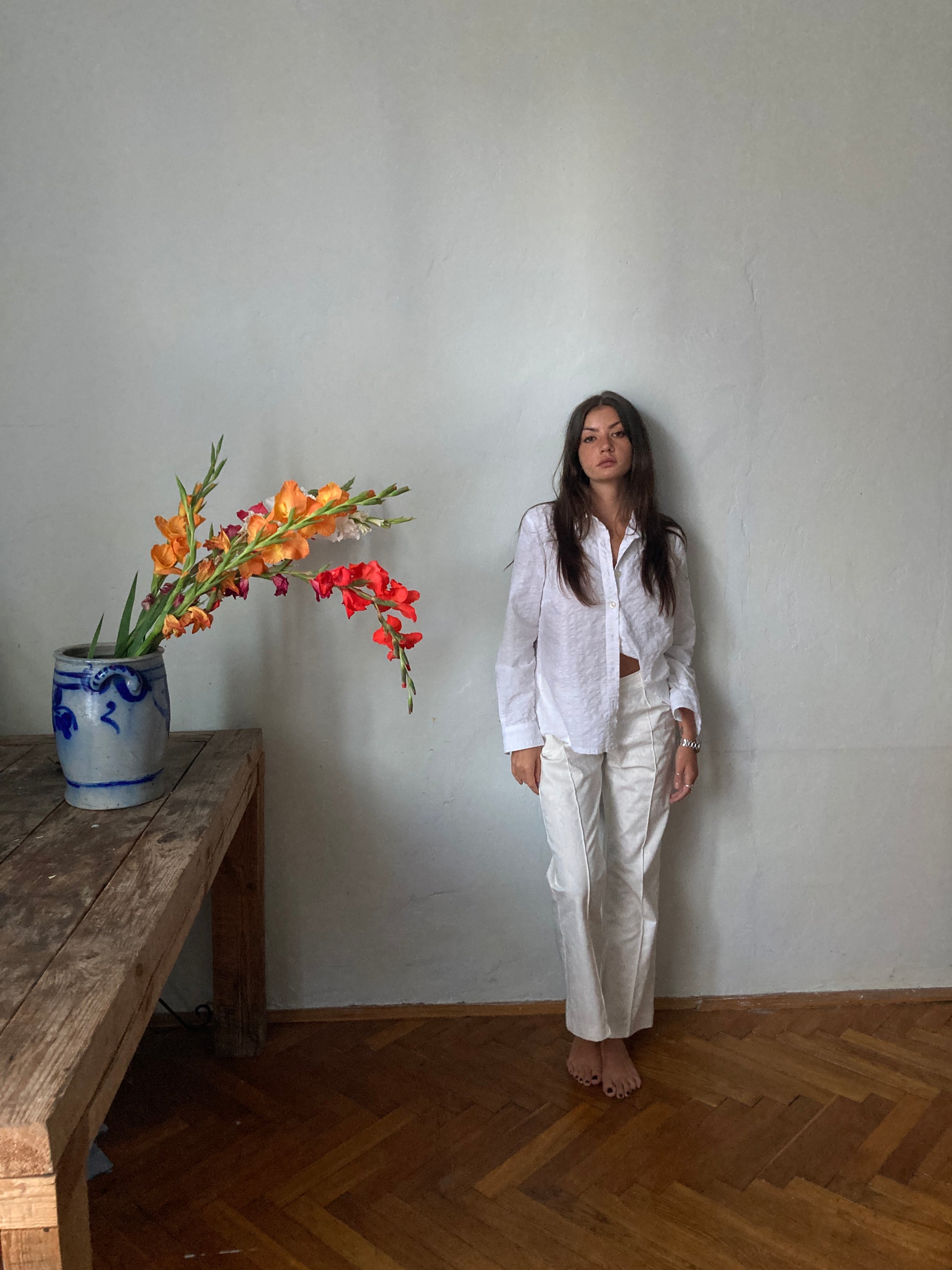 Wykonana z tkaniny z recyklingu koszula z bawełny typu kora o charakterystycznej fakturze. Uniwersalny krój, odpowiedni dla osób noszących rozmiary od S do L.