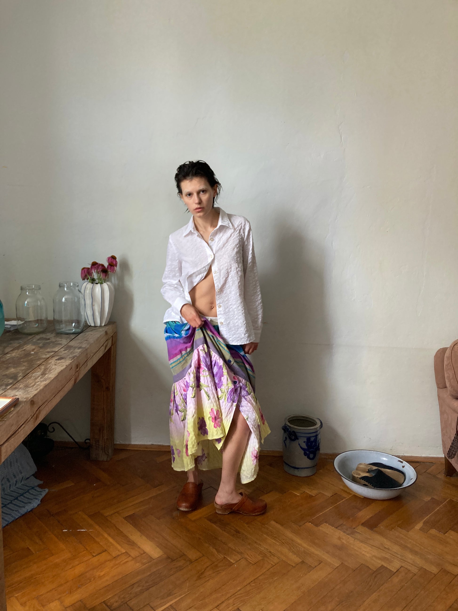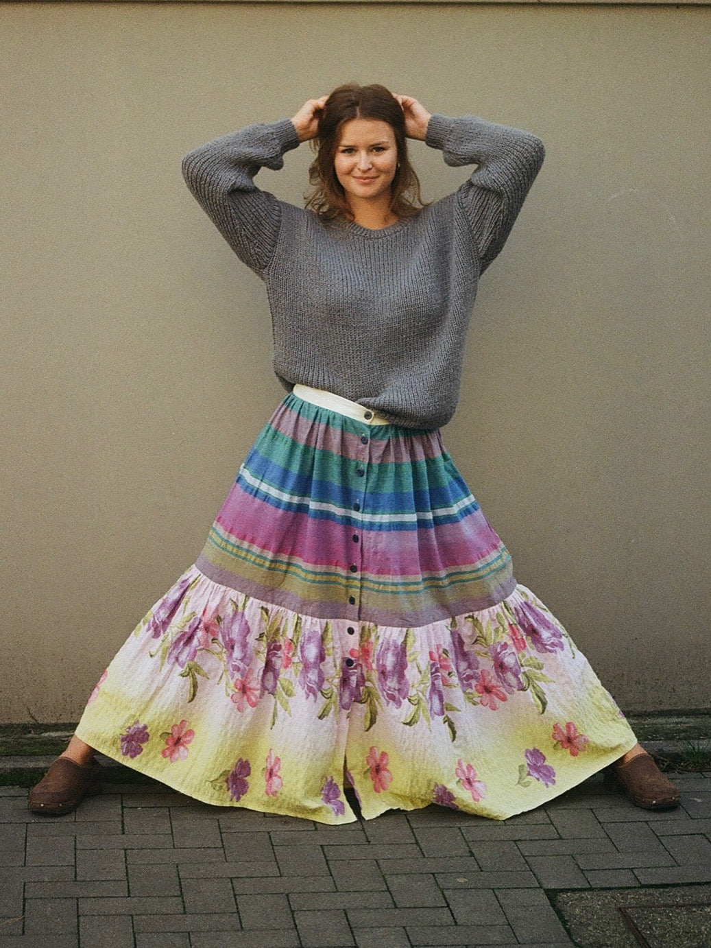 Długa spódnica z szeroką falbaną u dołu, wykonana z tkaniny vintage. Unikatowy wzór. W sklepie znajdziesz również białą koszule uzupełniające look!