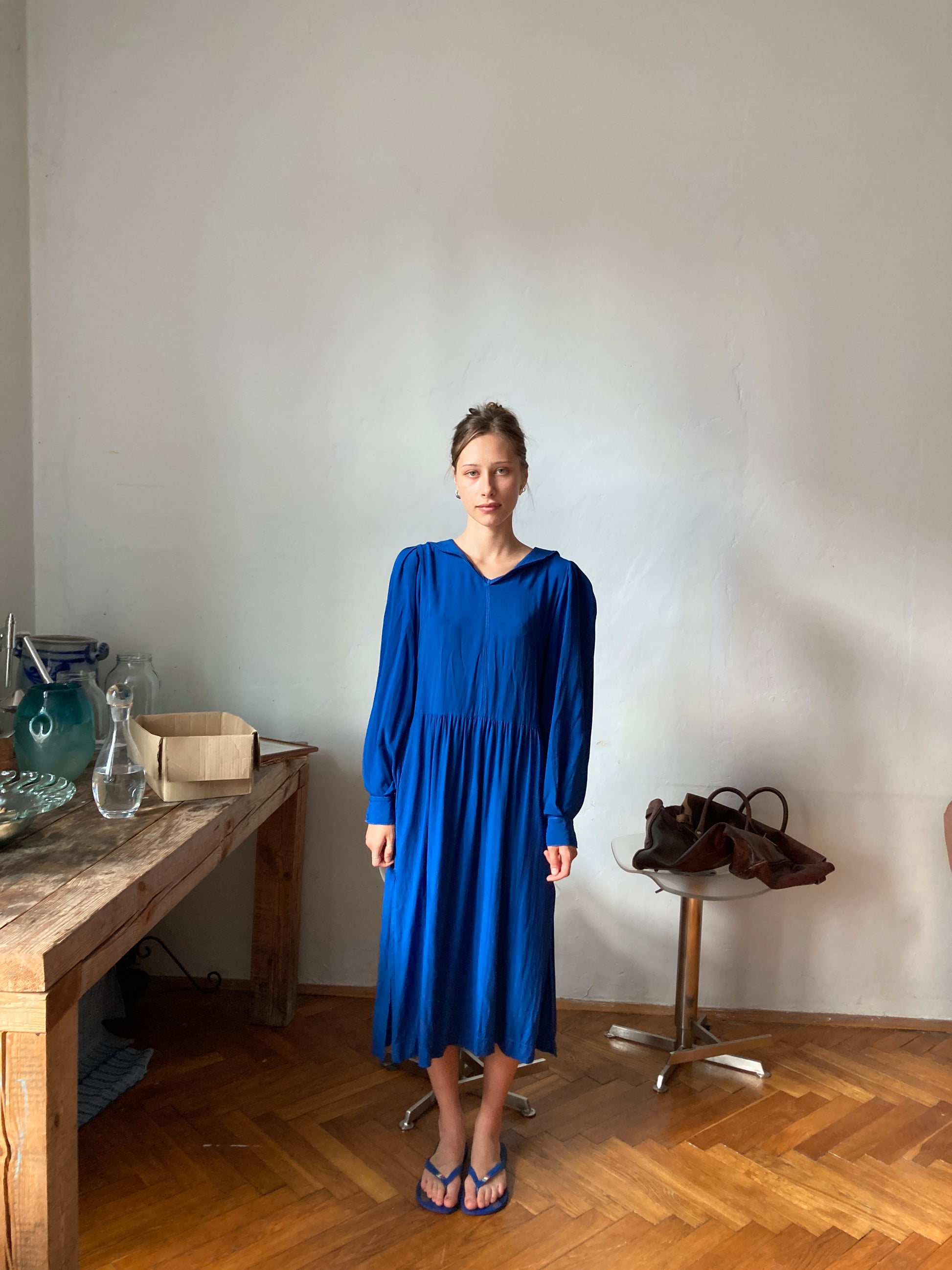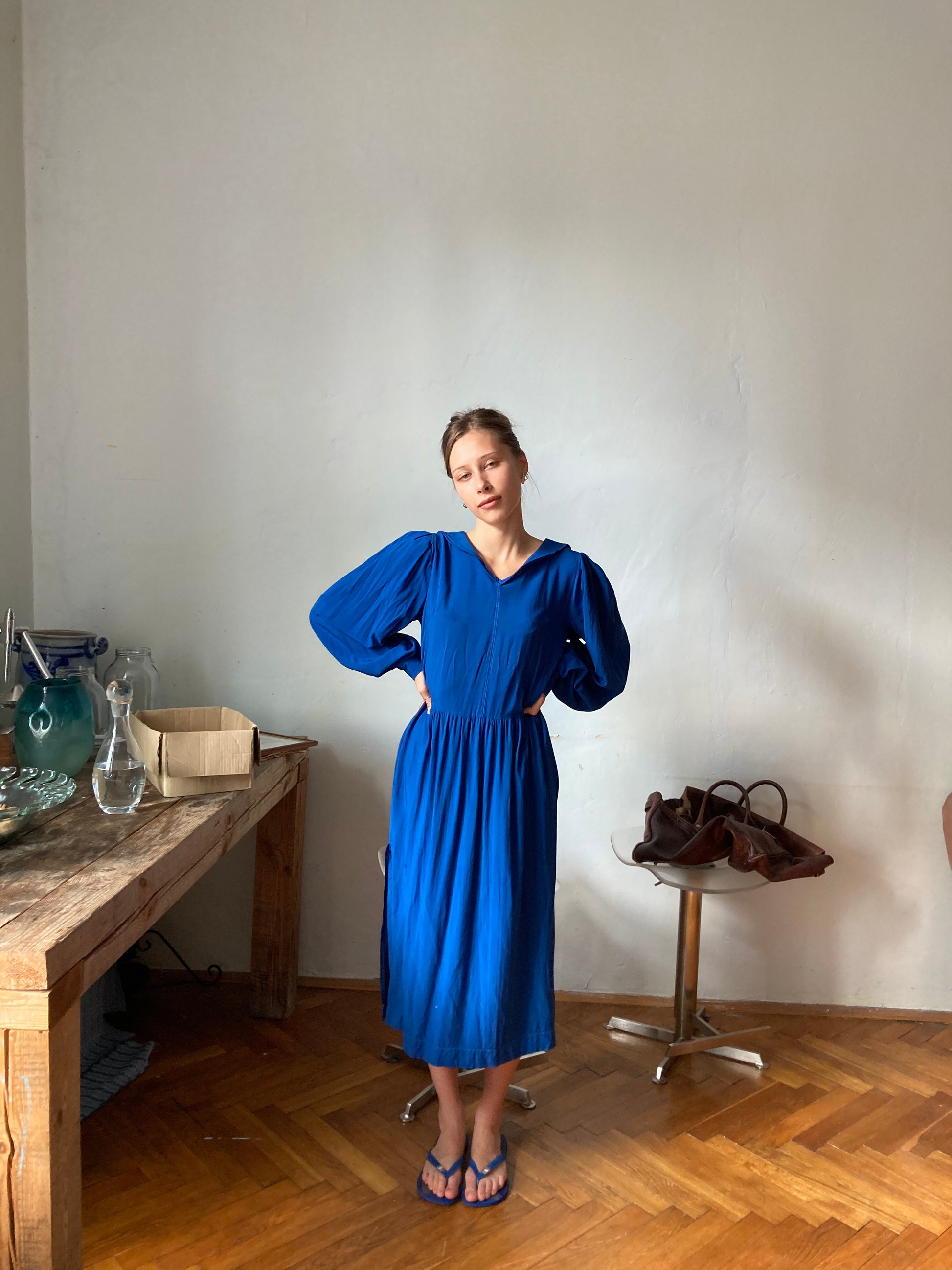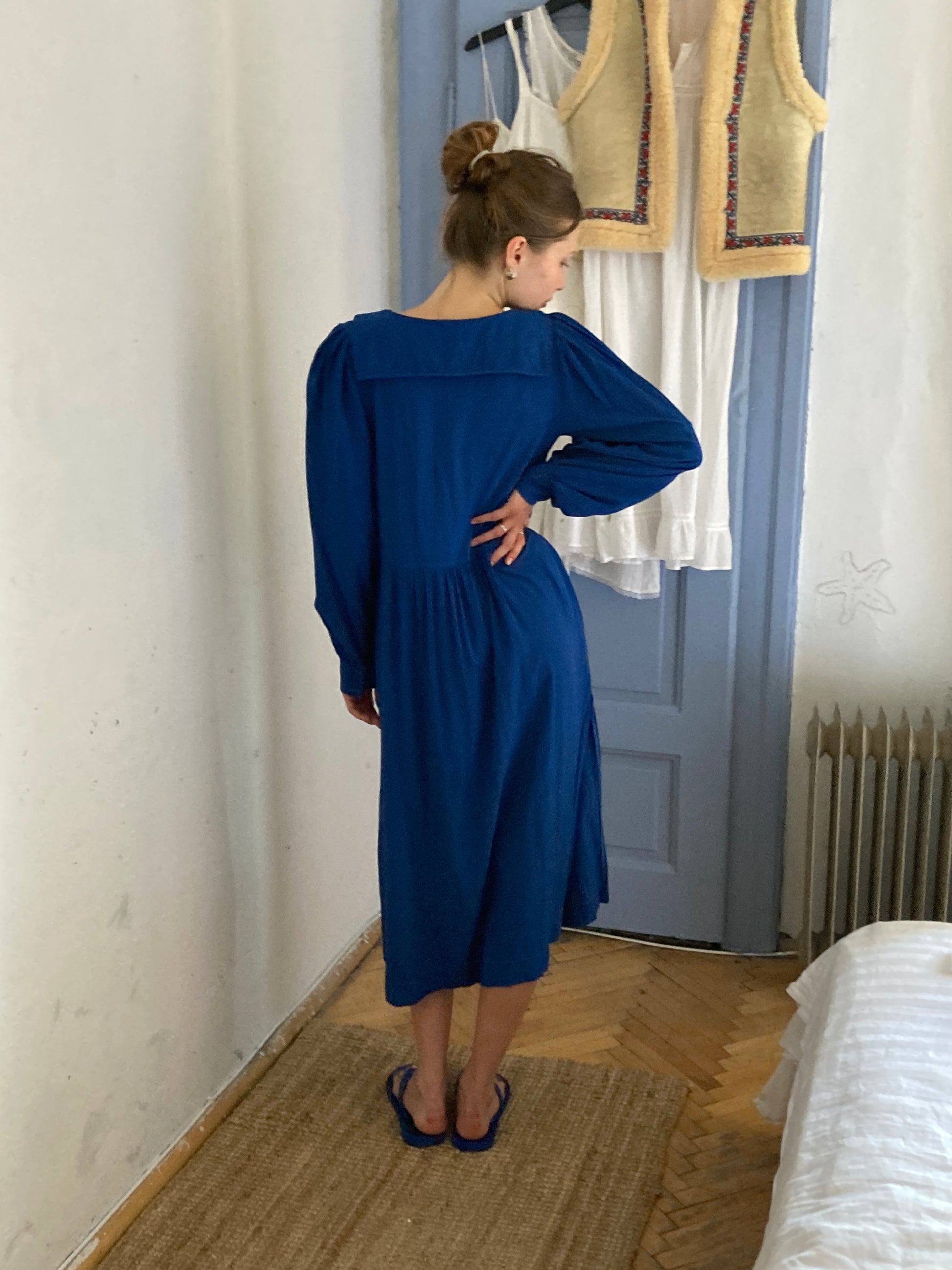 Delikatna sukienka z ręcznie farbowanej tkaniny. Z rozcięciami po bokach, marynarskich, wykładanym na plecach kołnierzem, wykonana z tkaniny o doskonałych włściwościach - tencelu.