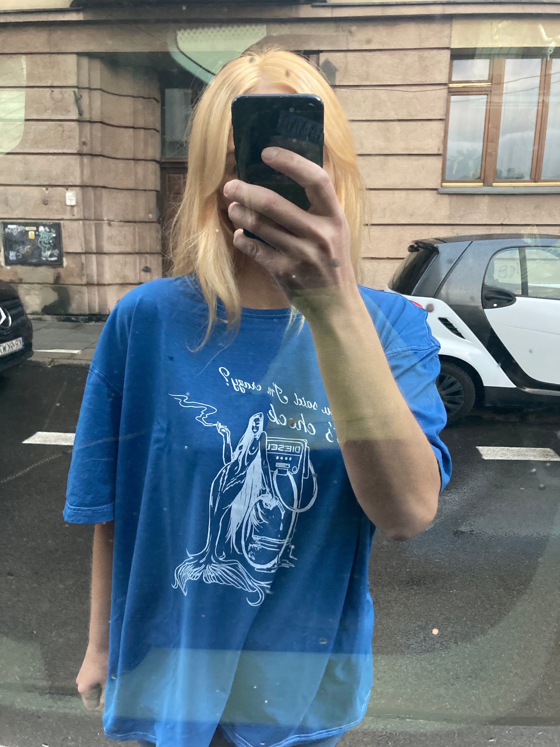 T-shirt vintage z autorskim nadrukiem. Każdy egzemplarz jest wyjątkowy. Ręcznie farbowany w odcieniach niebieskiego i jasnoczerwonego.