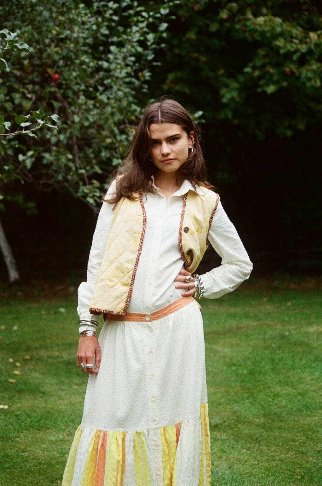 Kamizelka o swobodnym kroju idealnie układa się zarówno na koszuli jak i na t-shircie. Wykonana z tkaniny z lat 70tych, każdy egzemplarz jest unikatowy.